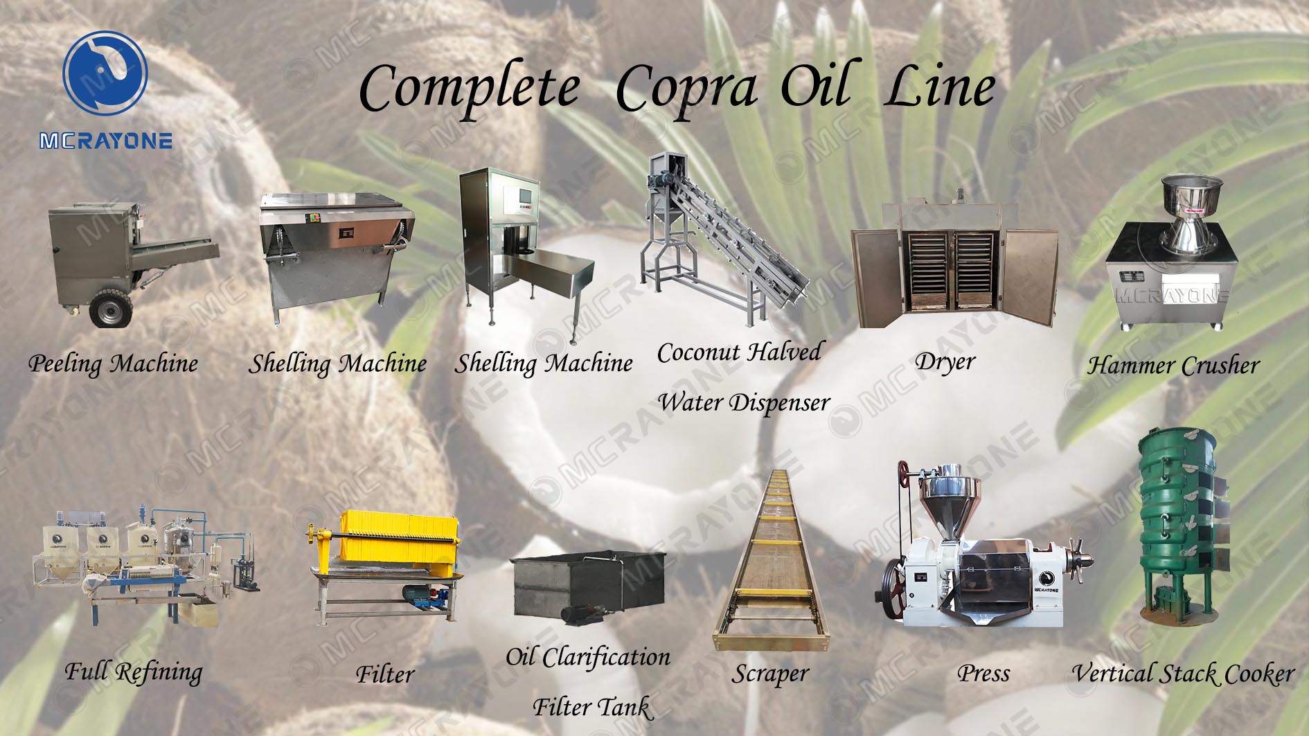 Сначала целые кокосы помещают в машину для очистки от скорлупы, чтобы удалить твердую внешнюю оболочку. Затем свежие кокосы помещают в устройство для удаления влаги. Высушенные кокосы затем обрабатывают в дробилке (или измельчают вручную), после чего помещают в шнековый пресс для извлечения масла с использованием традиционных методов физического прессования. После получения первоначального кокосового масла его обычно помещают в пластинчато-рамный фильтр-пресс для удаления некоторых твердых примесей, в результате чего получают сырое масло и кокосовую муку. Последнюю можно использовать в качестве корма или удобрения, а сырое масло можно продавать напрямую или подвергать дальнейшей очистке для удовлетворения потребностей европейского и американского рынков, в зависимости от спроса и требований политики.